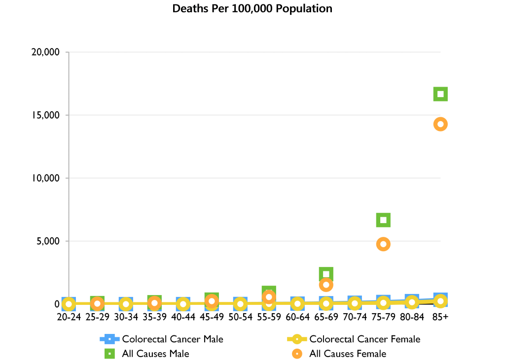 OK, what if I ignore the findings and keep eating those delicious salt beef sandwiches? I might get colorectal cancer, but there’s a much, much higher risk that something else will get me first. Here’s the risk of death by colorectal cancer versus other all causes for different age groups.